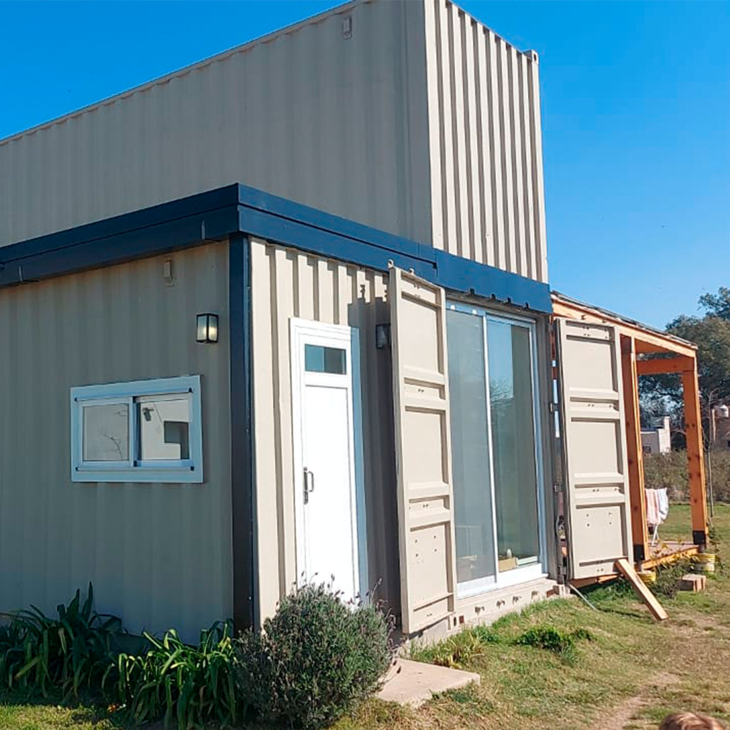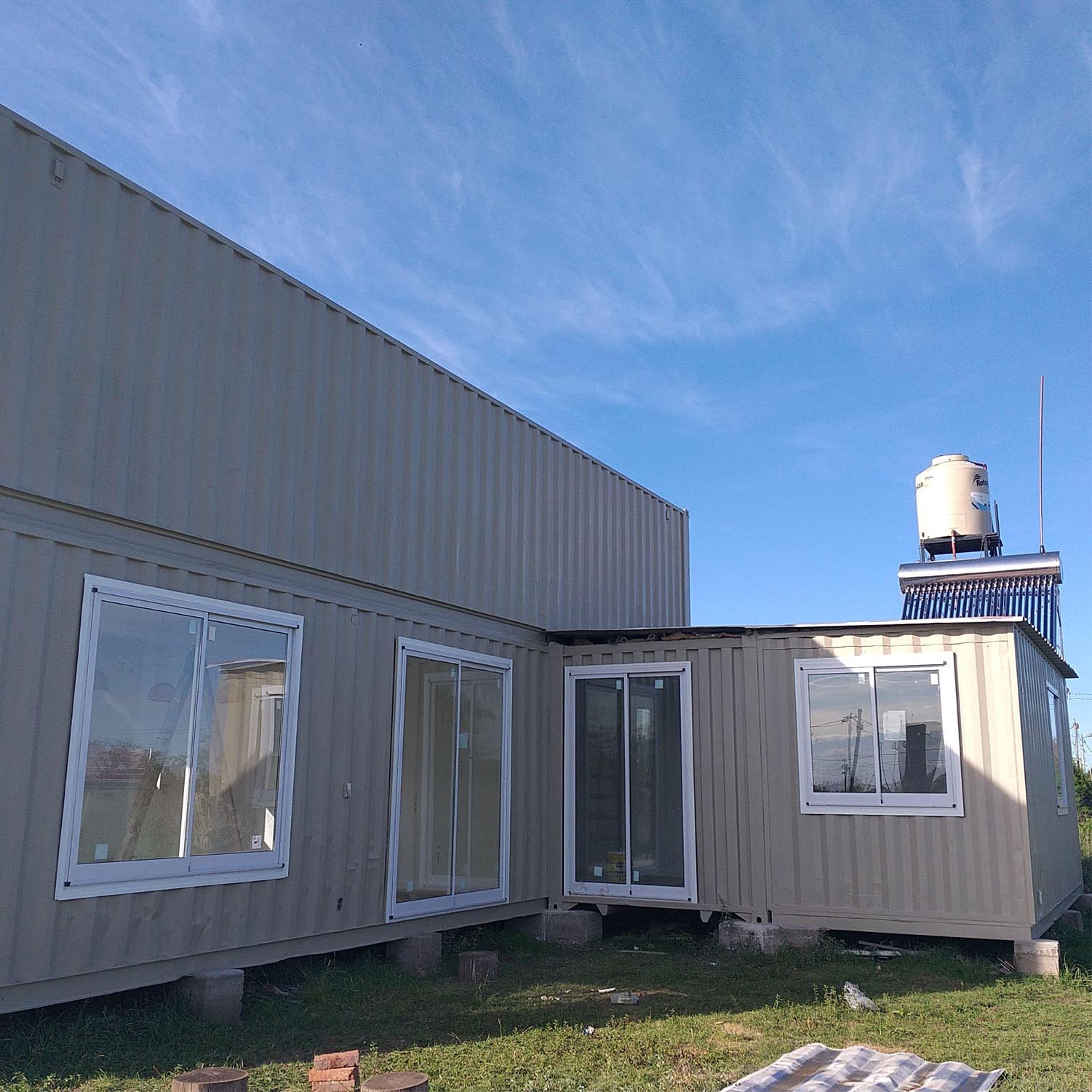 Estructura de 3 contenedores con revestimiento aislante interior termoacústico de poliuretano expandido, exterior con pintura y tratamiento anticorrosión.